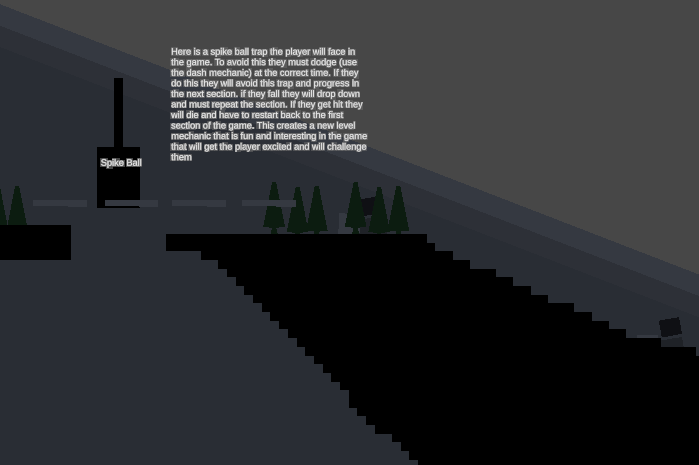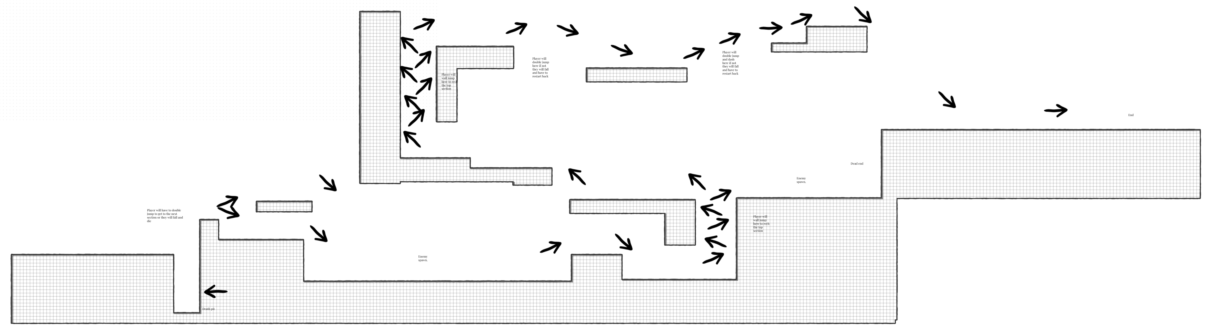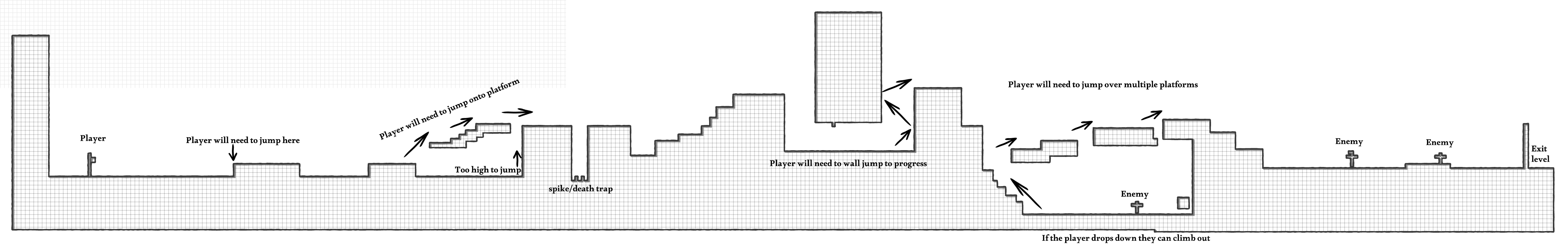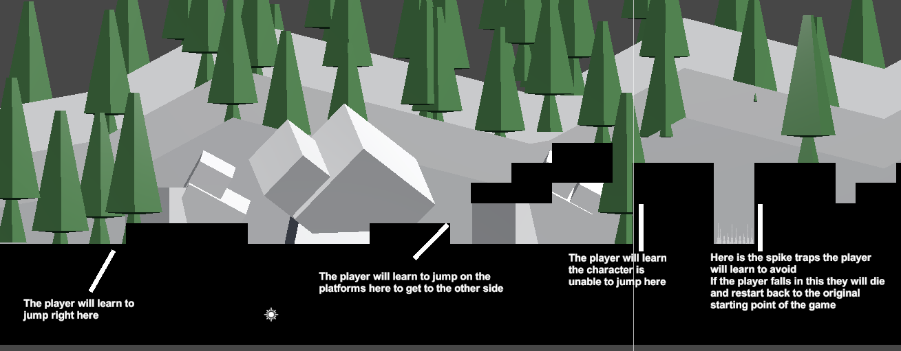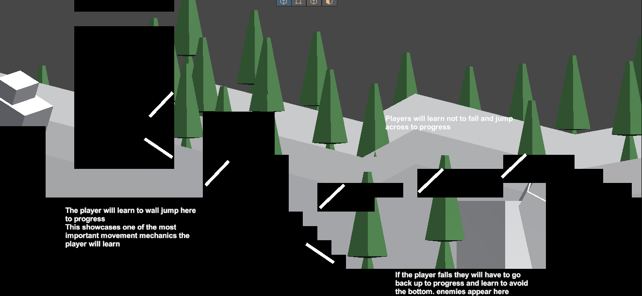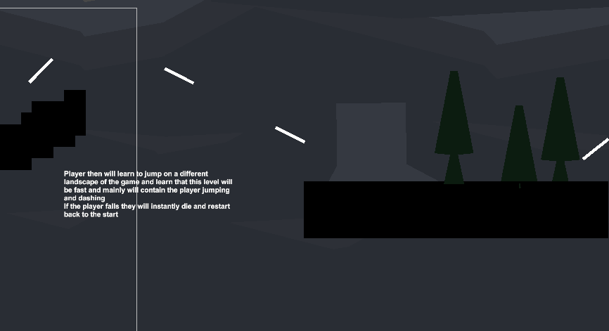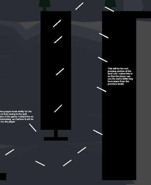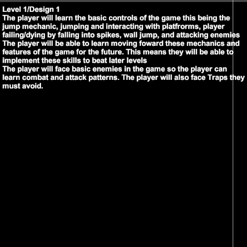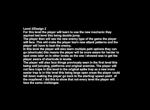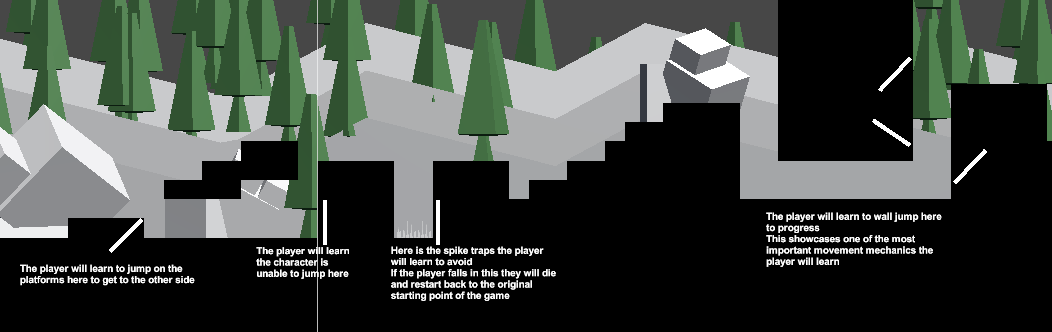 For the 3 images showcasing my level design as you can see there are text boxes with arrows which tell the player what should be here or what they will learn. I started off with teaching the player how to walk and jump in the first section of my level. This is so the player understands the basic mechanics of the game. They will also understand the player cant just jump to the section and must jump on multiple platforms to get to to their main point to progress. I have also added spikes (spike trap) which the player will have to jump over to avoid. Then, I showed the player the use of a new ability of the wall jump mechanic. Followed by a jump section they will have to do unless they will fall to the bottom and must climb back up which there will be enemies. In the last section the player will face more enemies before progressing to the end
