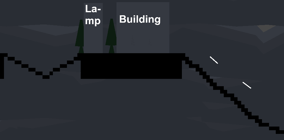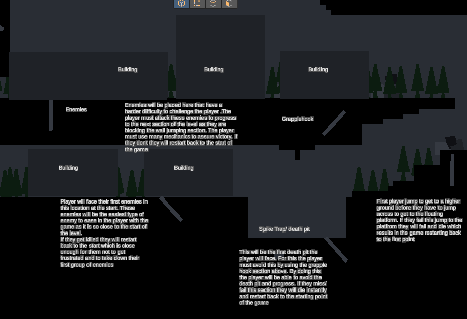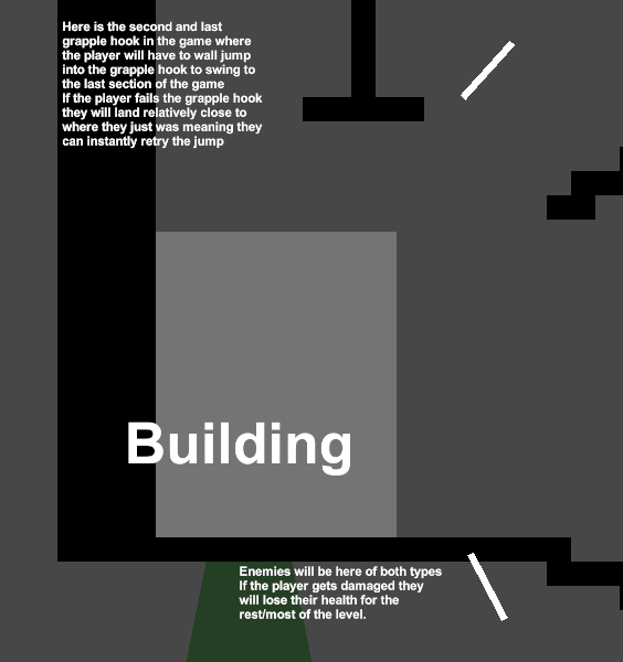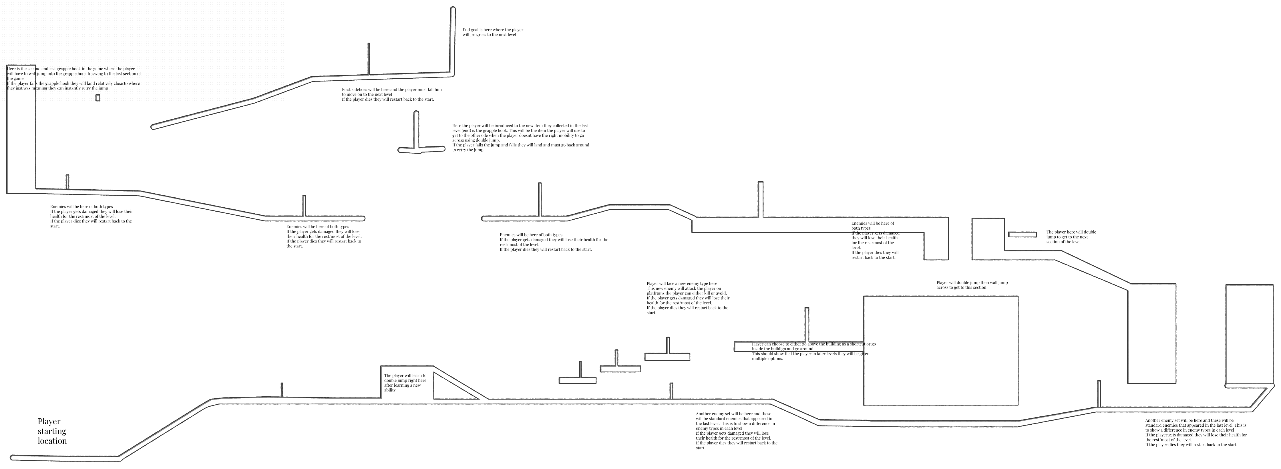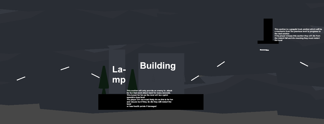 These pictures show various parts of my level. The first one being where the player starts and advances up to a point that they have to double jump to progress. After this, the player will be introduced to a new section i have added for the game. Firstly, the player will have to fight a bunch of enemies and chose whether or not they would like to jump on these platforms and go on top of the building and progress that way or go around and use the wall jumping method to climb up. The first (TOP) route is the fastest and is to show there will be multiple alternative routes later. After that section then the player will face more enemies and then use the new grapple hook mechanic which the player will have to swing across to get to the other side. Where then they will face more enemies before coming across a wall jumping grapplehook section for the player to reach the top of the map going on to the side boss and finishing the level.