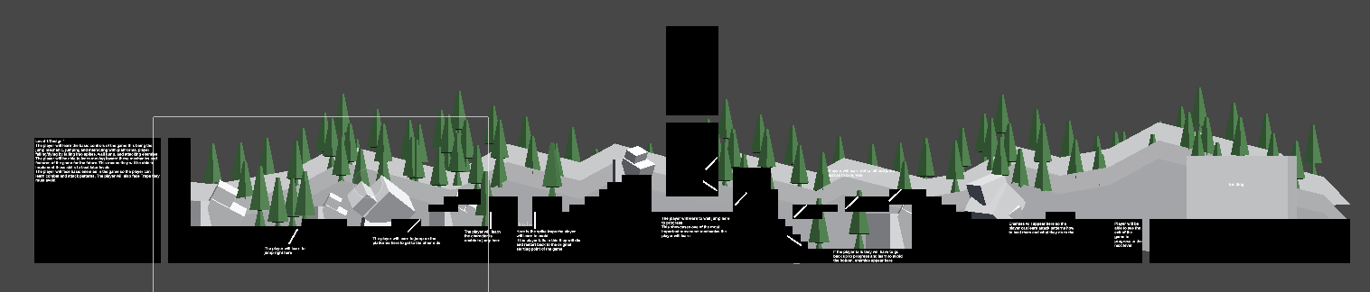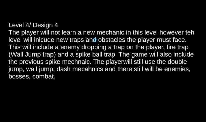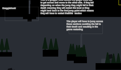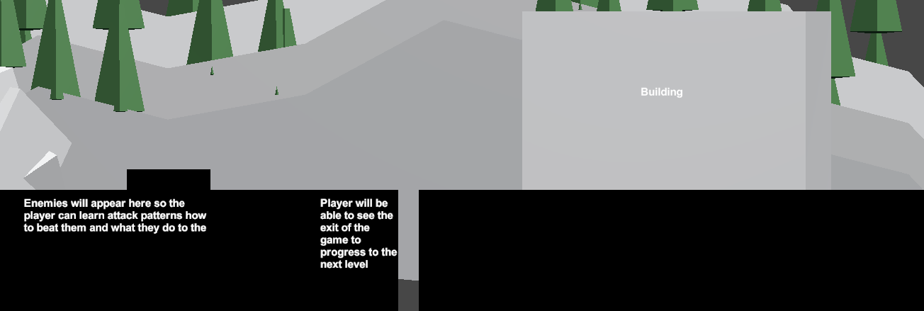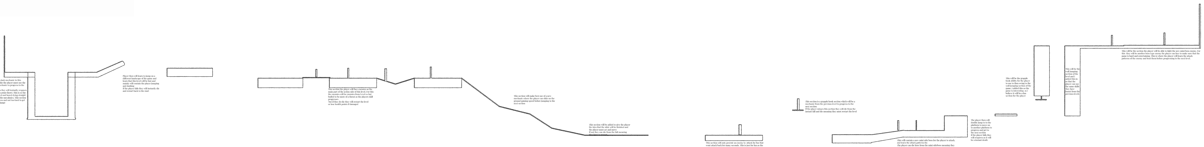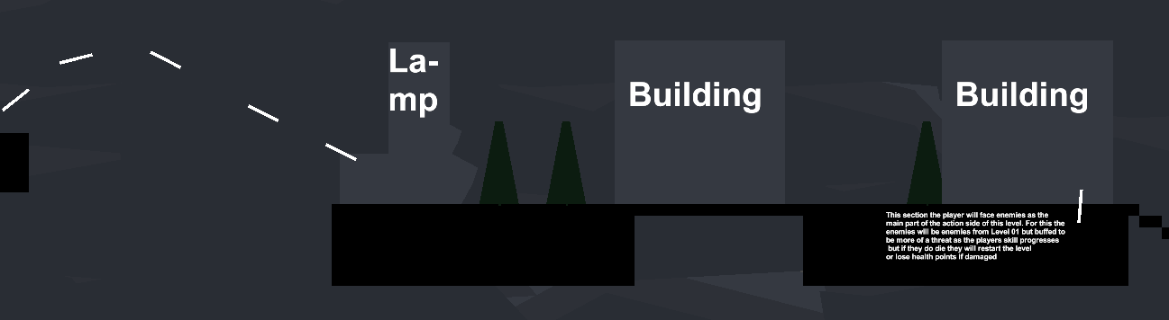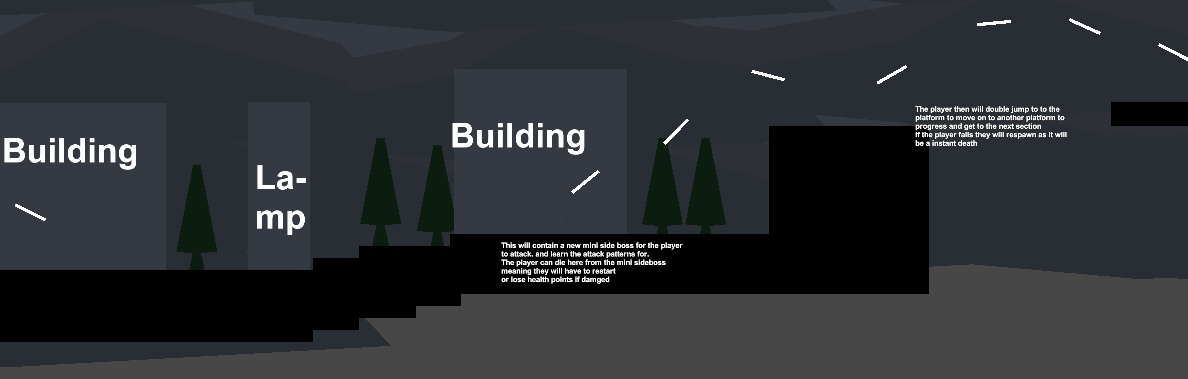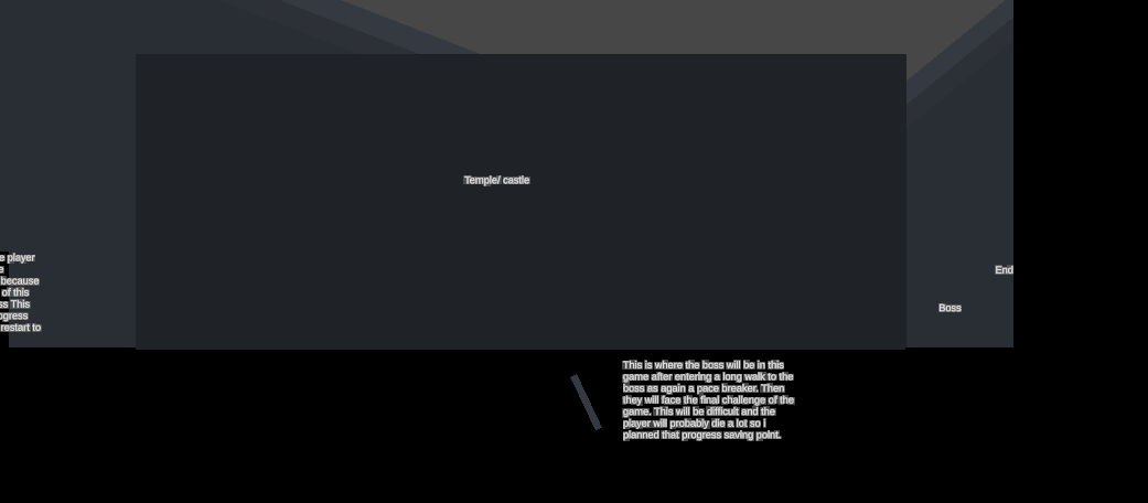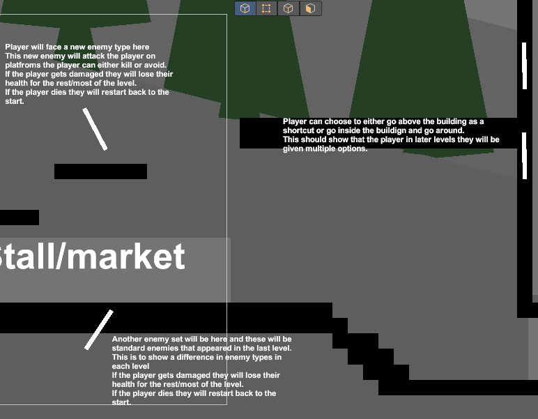 For the final product of my game i created 4 levels the player will be able to explore using the mouse showcasing what i want to create for my game and how the player will play it (From my perspective) in text. The text will also showcase what mechanics they will use and what the player will face and the consequences they could face from that. Due to time i couldn't create a basic design for some of these assets so instead i have added a box with text stating what i want for this. I have also created a box to the left of the start of the level which showcases what the player will face in the level and what mechanics will be used.