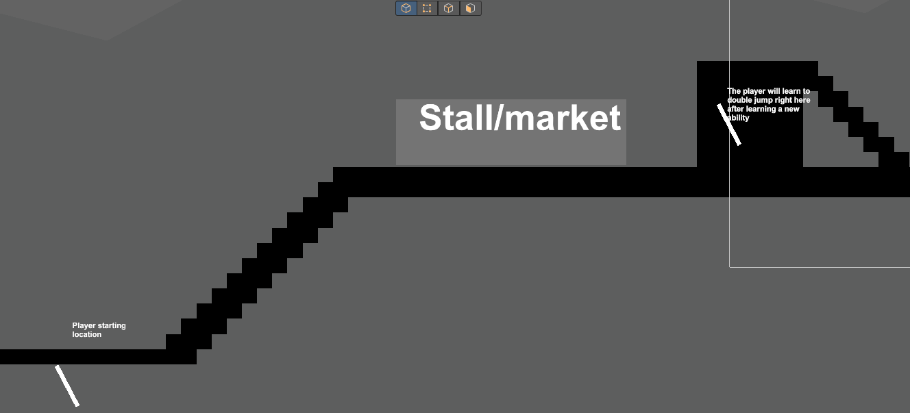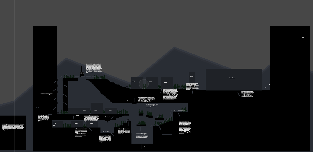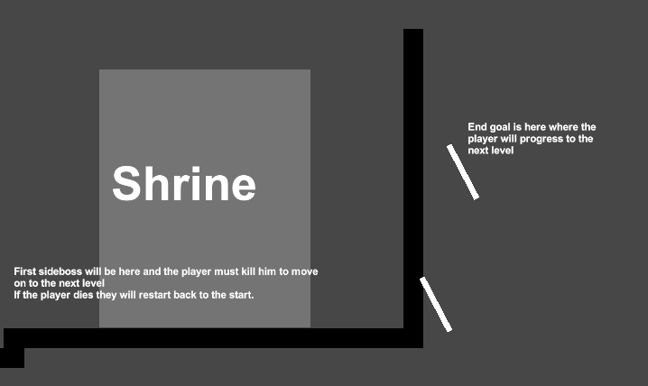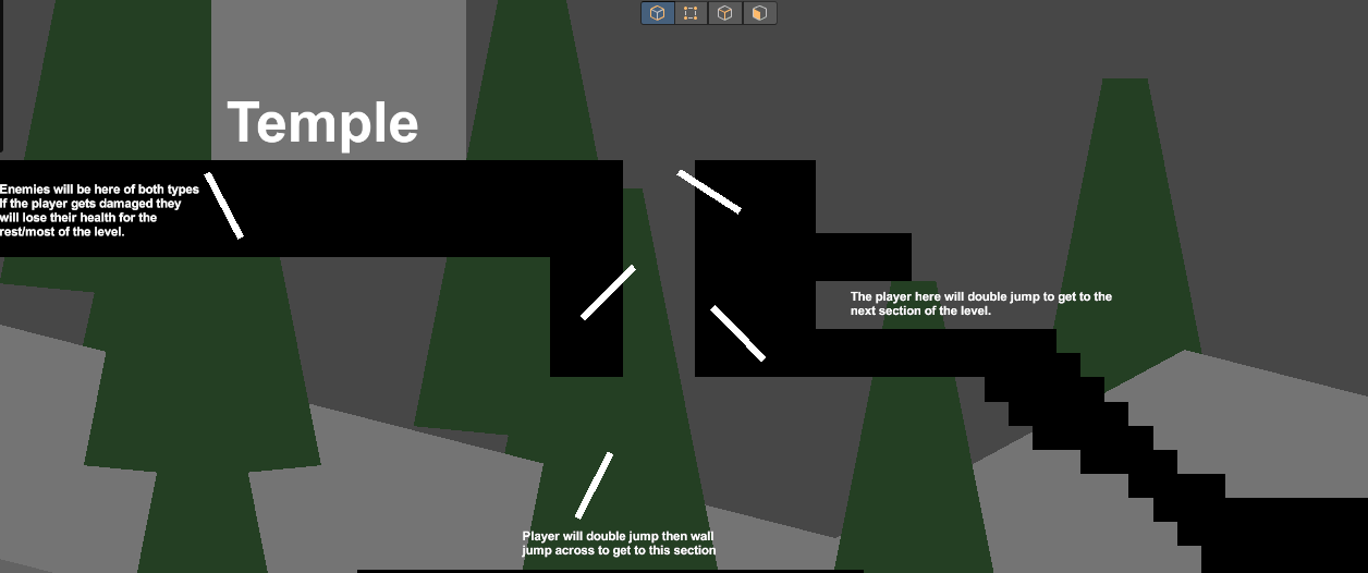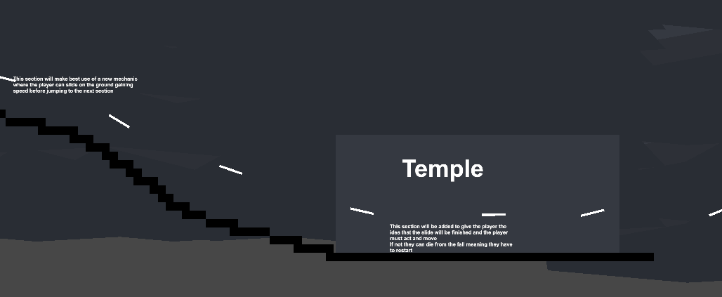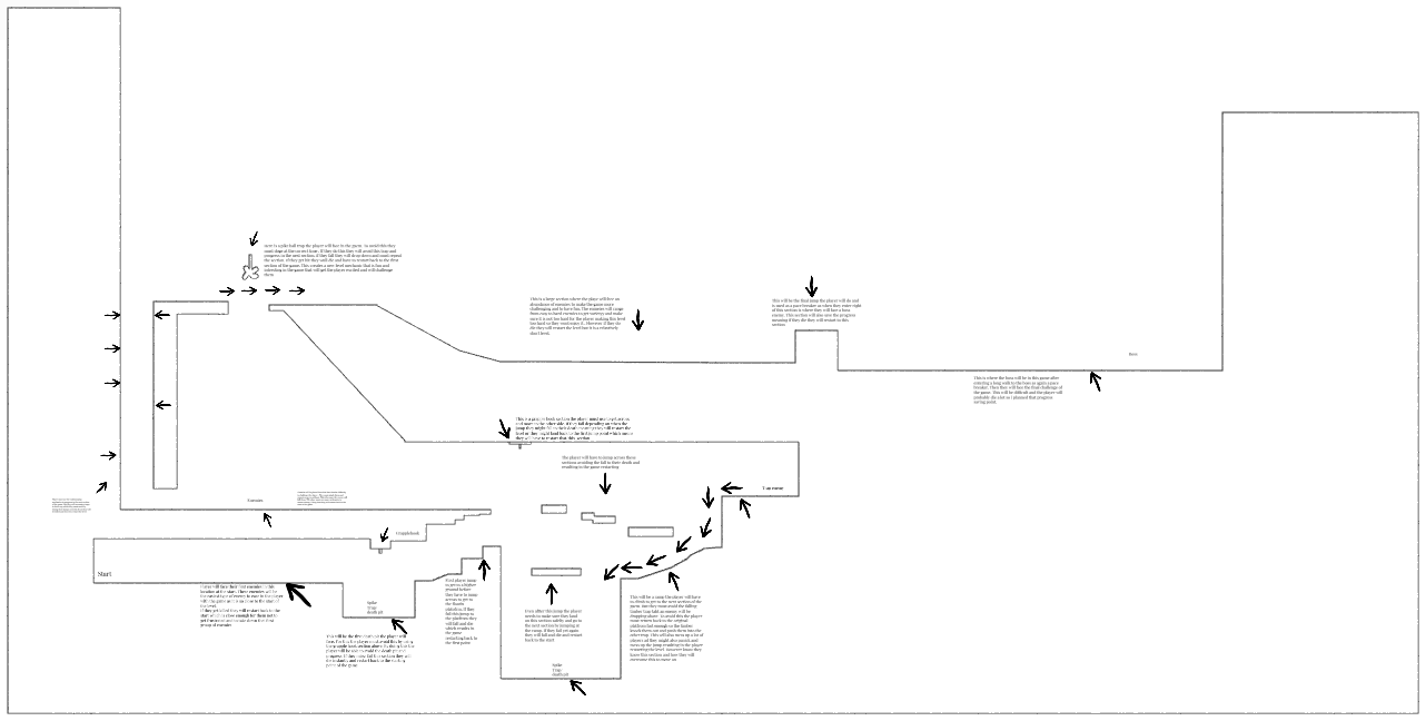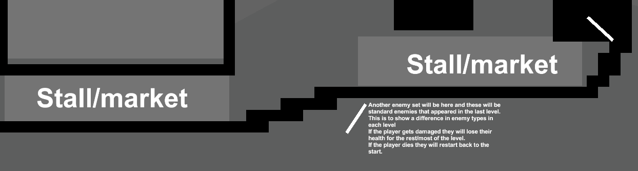 For the final product of my game i created 4 levels the player will be able to explore using the mouse showcasing what i want to create for my game and how the player will play it (From my perspective) in text. The text will also showcase what mechanics they will use and what the player will face and the consequences they could face from that. Due to time i couldn't create a basic design for some of these assets so instead i have added a box with text stating what i want for this. I have also created a box to the left of the start of the level which showcases what the player will face in the level and what mechanics will be used.