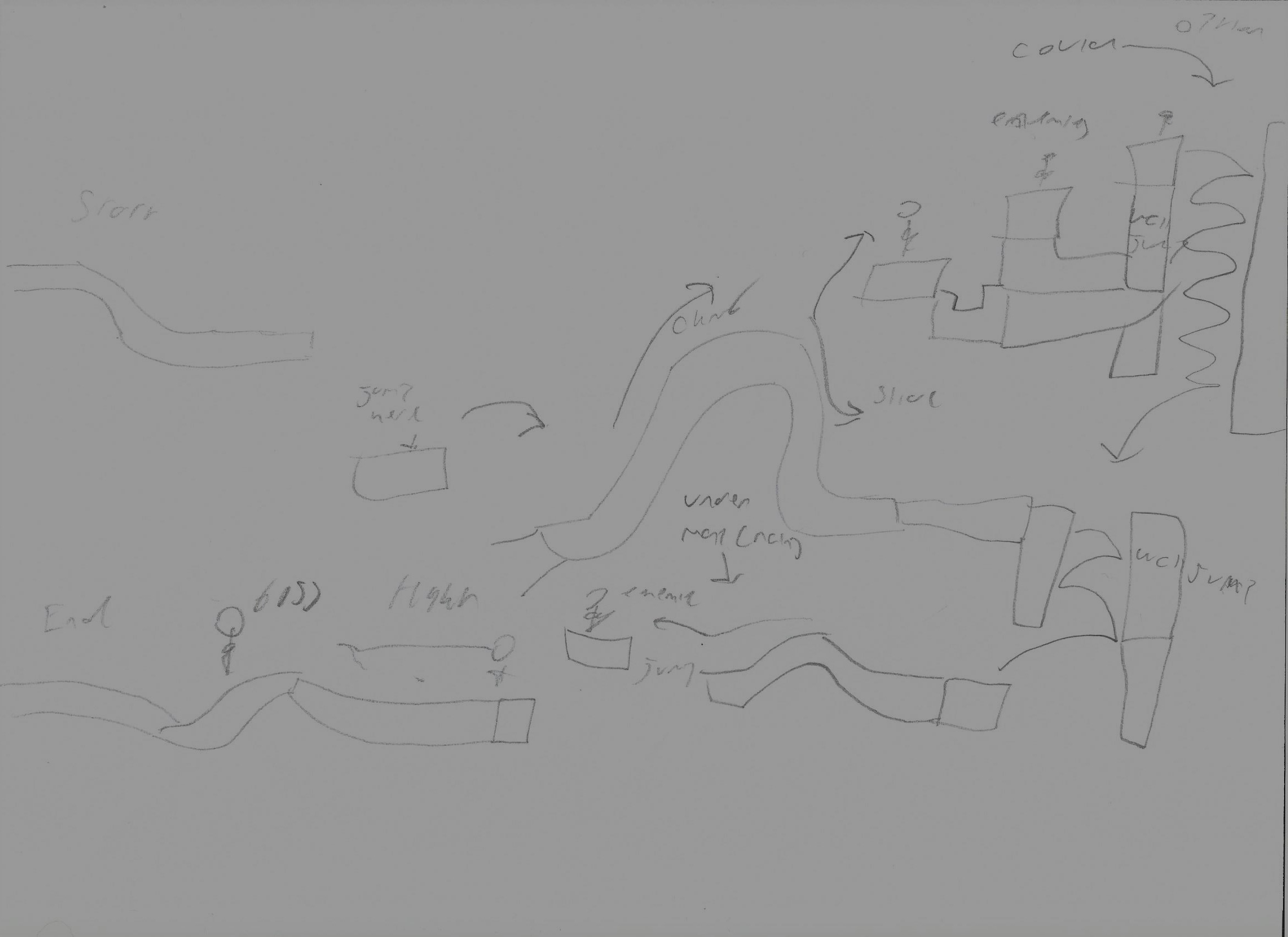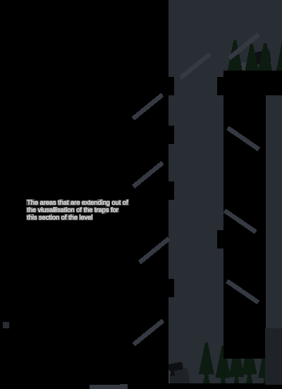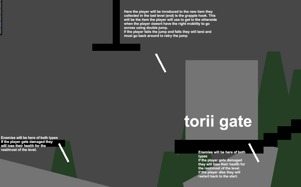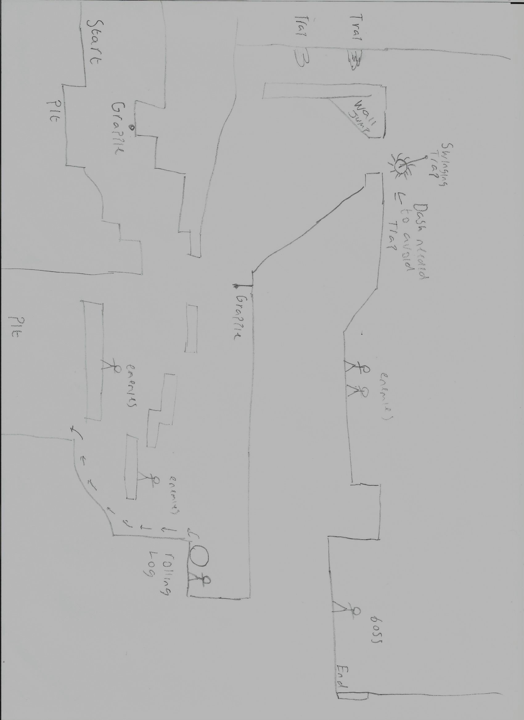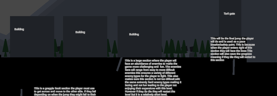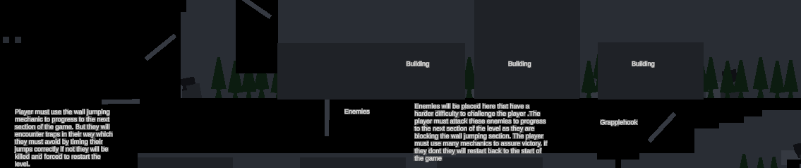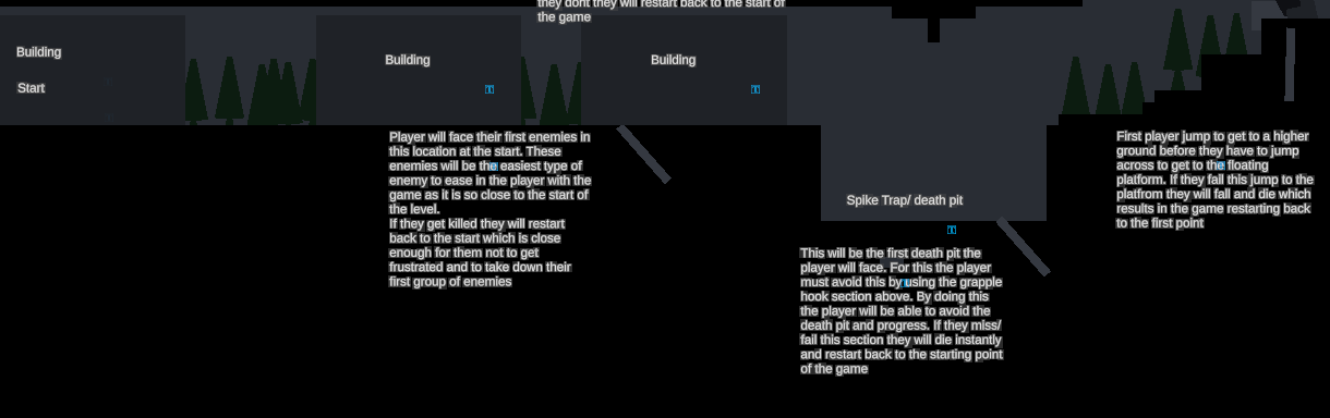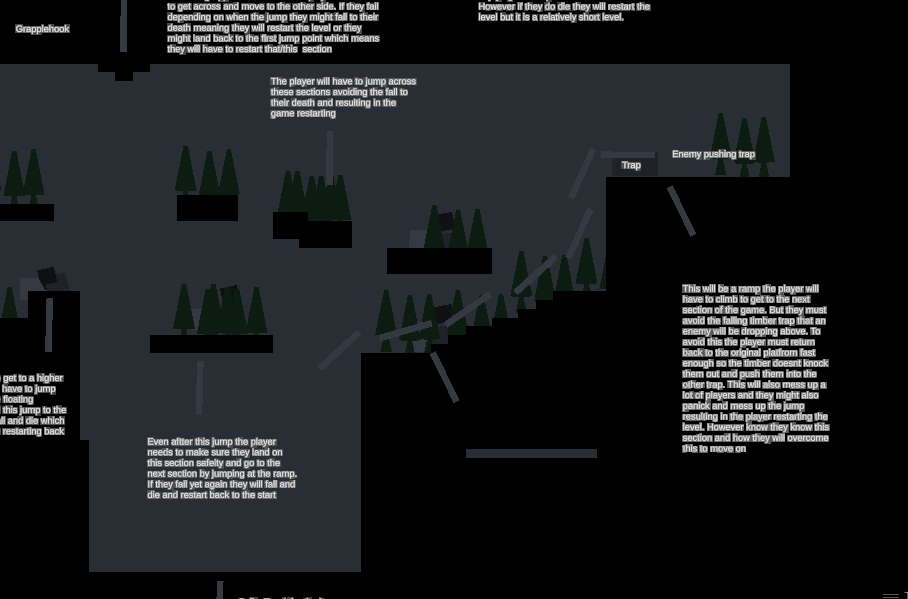 First the player will instantly face enemies before having to grapple hook to avoid the trap below. Then they will jump to get to higher ground so they can move to the next platform without falling off the ledge. Then the player must jump on the ramp and avoid the log trap by going back and returning to the previous platform and timing the next section to avoid this and to jump to the next platform. After this the player will jump to other platforms before using the grapplehook mechanic to swing to the other side to face more enemies. After the player takes these out they will have to go and use the wall jump mechanic to climb up to the top of the level whilst avoiding fire traps. The player must time their jumps to not get hit by this trap. after this the player will have to face a spike ball trap which to avoid they must successfully use the dash mechanic at the right time to go past it and avoid the attack. If not they could either have to restart or fall to the bottom section again. Then they will have to face a large amounts of enemies before getting to a safe point to face the boss at the end of the game which the player must take out to finish the level.