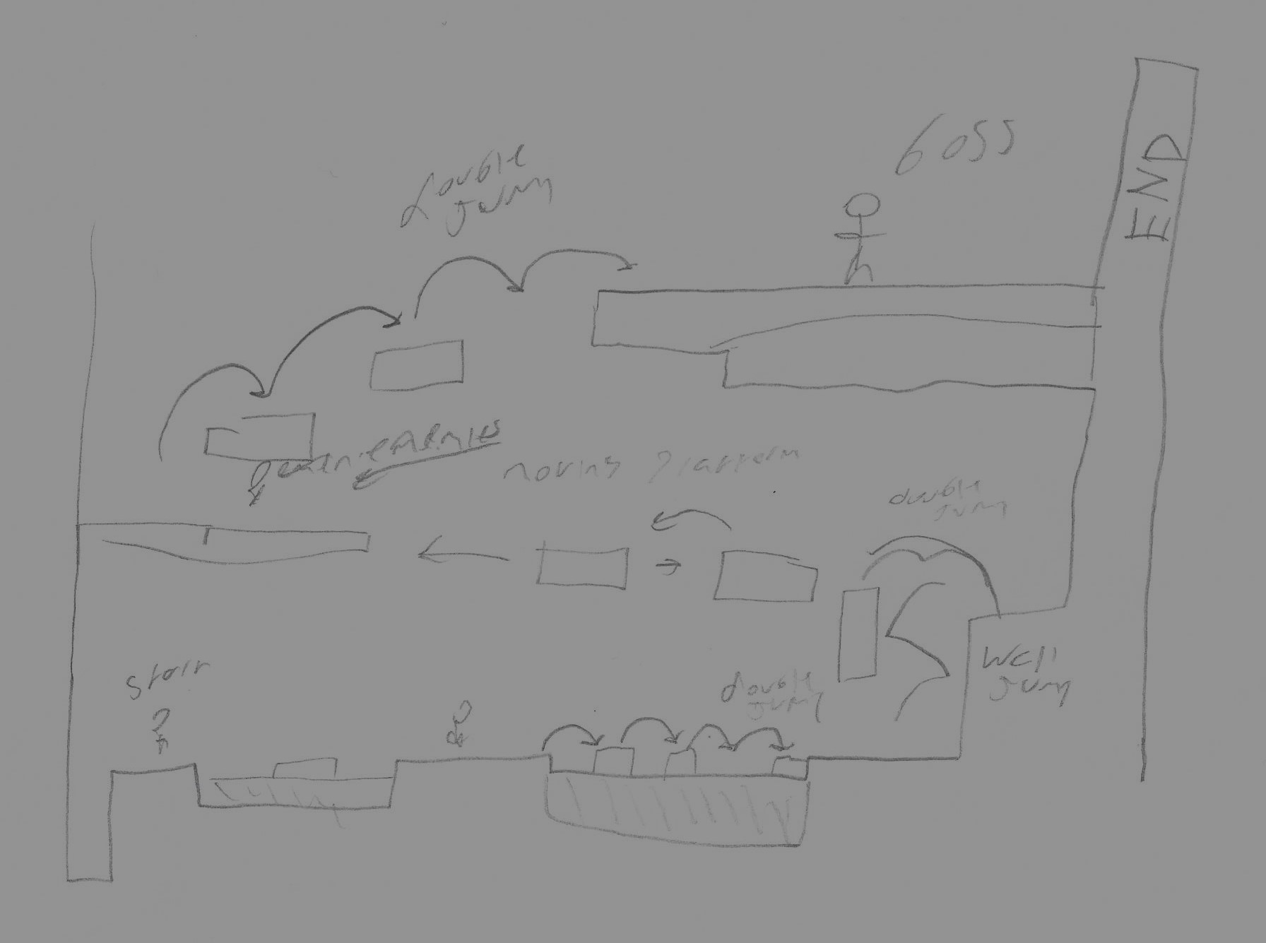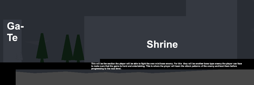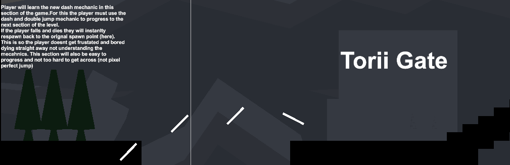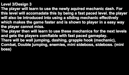 As the player has learnt a new mechanic called dash i first showcased the mechanic as the player will have to use it to jump past a section if not they will fall and will have to restart the level. The player will then have to use this mechanic after climbing up a section to progress to the next platforms in the game. This will be repeated again until the player must fight a bunch of enemies. Then the player will go down a ramp before jumping and progressing to the next platform where they will have to take down an enemy. Then they will use the previous grapple hook mechanic to swing to another section facing more enemies/ side boss. Then they will jump on a platform and again using the mechanic grapple hook swing to the wall and wall jump to the top of the section before facing a mini boss.